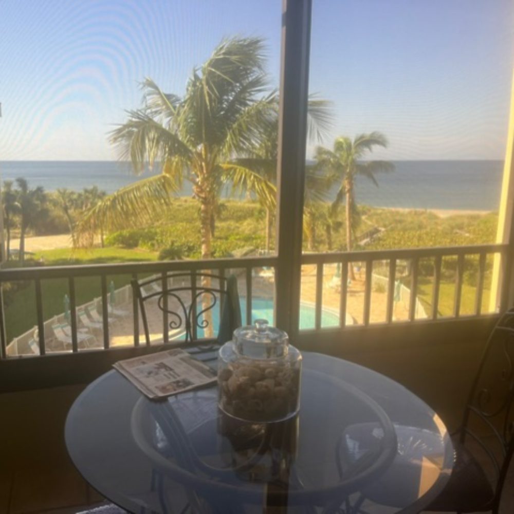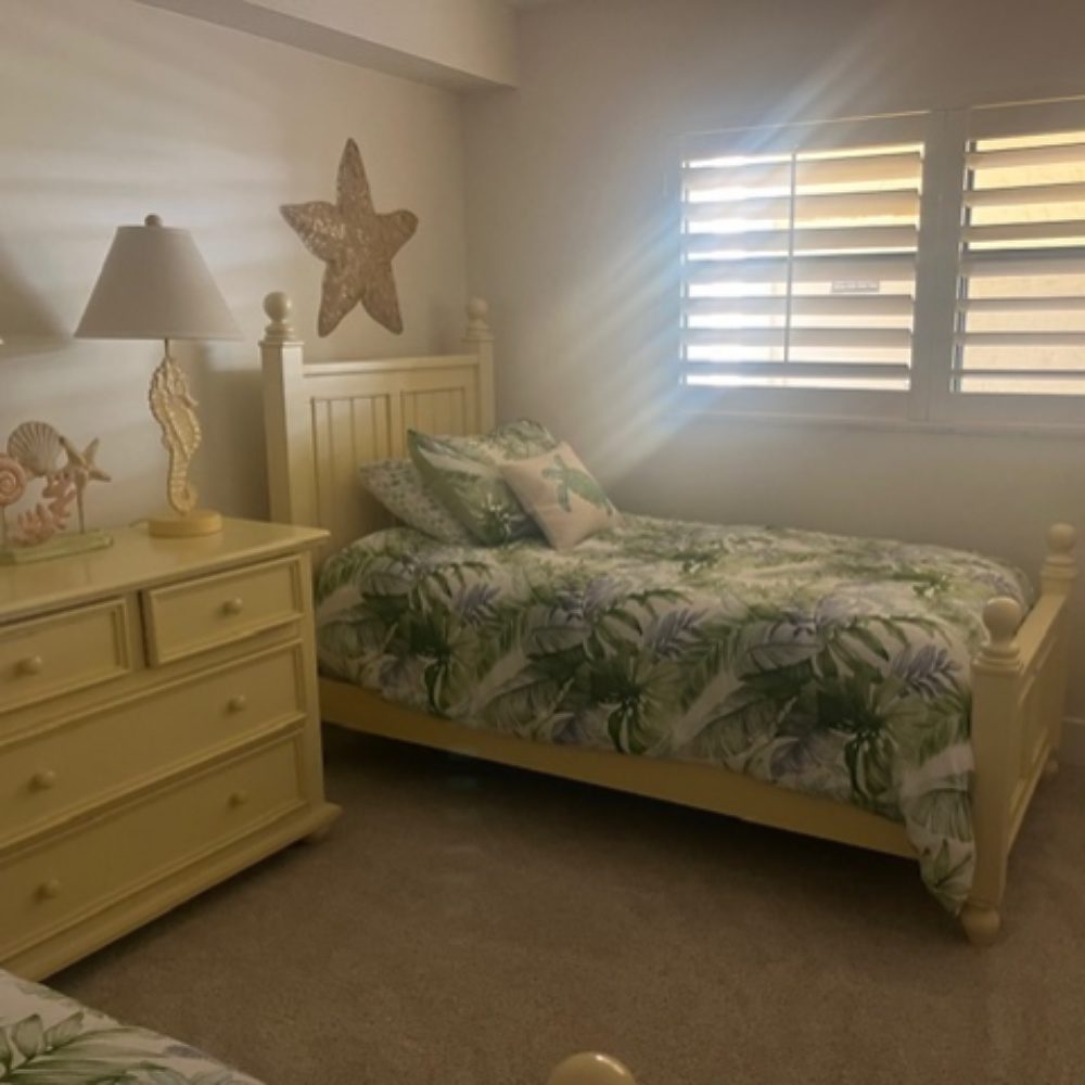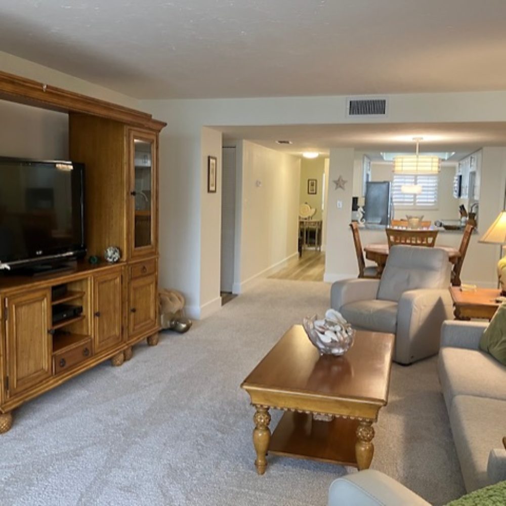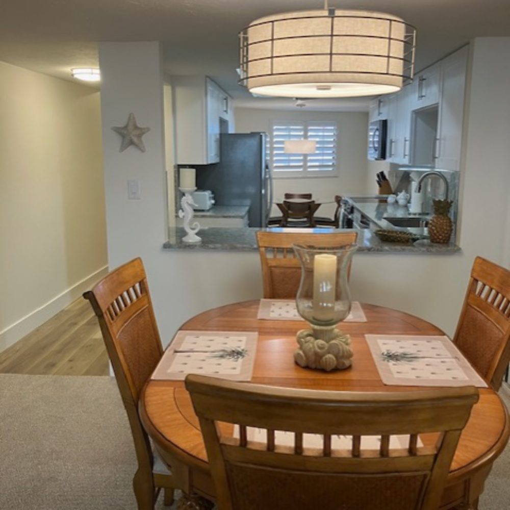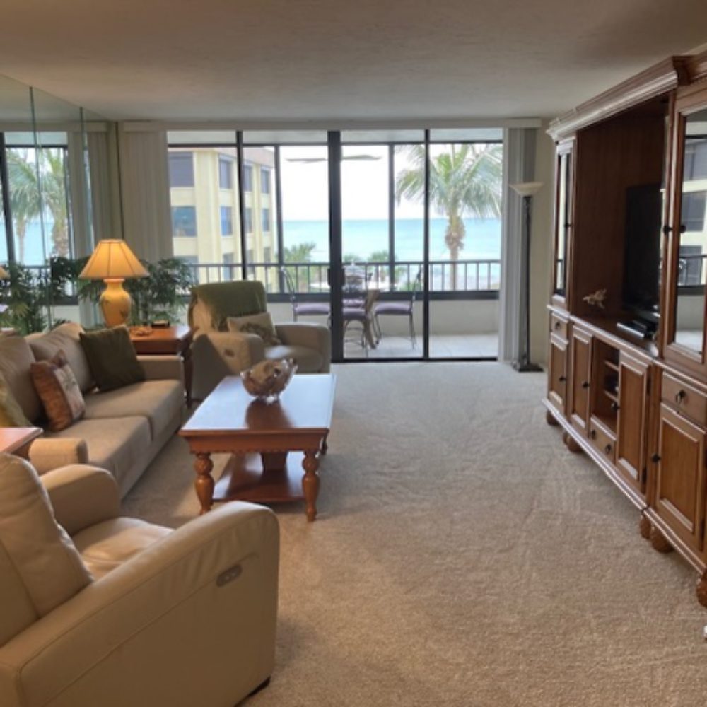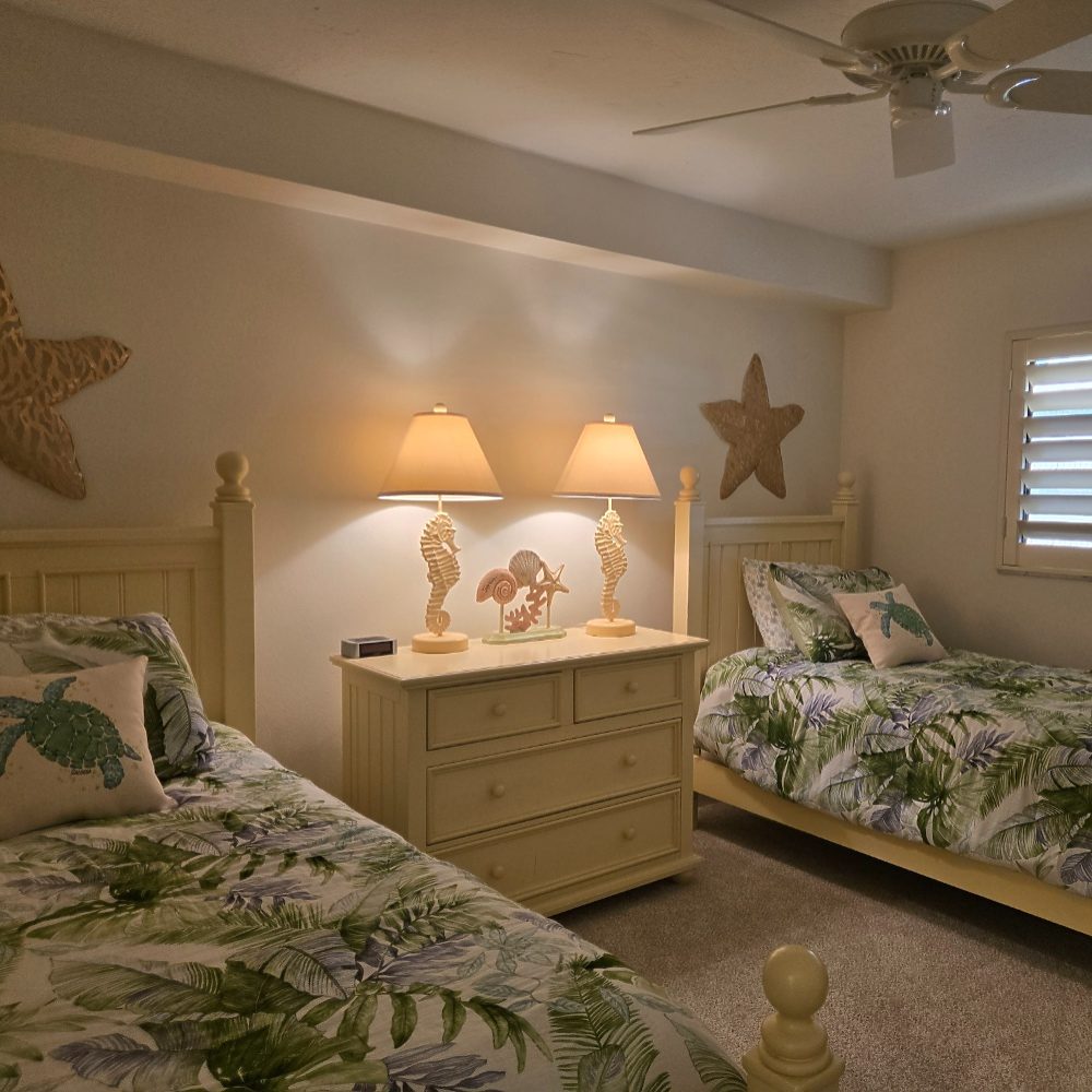 Attractive decorated 1,445 sq ft 4th floor, two bedroom, two bath condo with great views of the Gulf of Mexico and the Island Reef grounds. Living room includes a 46" HD flat screen TV and Blue Ray DVD player. Master suite features a king size bed and 32" flat sceen TV. In the master bath the walk-in shower has a grab bar. Guest bedroom has two twin beds and a flat screen TV. Fully equipped kitchen and a laundry area. Grab bars in master bathroom.